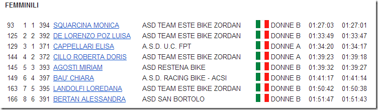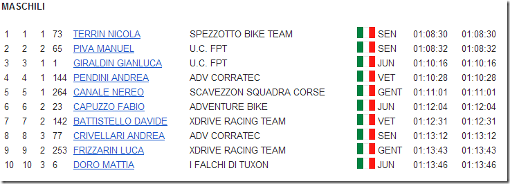 Ben 200 bikers comunque si sono iscritti alla gara più vecchia dei Colli Euganei, nonostante le previsioni meteo suggerissero di rimanere a casa sotto le coperte. Una cosa bisogna sottolineare: la formula della Super Coppa sembra azzeccata e gli ordini d’arrivo odierni lo dimostrano. Certamente, i valori in campo sono alti e più o meno chi sta in classifica alla Coppa Colli è li davanti, ma le posizioni cambiano: oggi è stata la giornata di Nicola Terrin (Spezzotto) ad averla vinta su un Manuel Piva FPT,giunto a soli due secondi, cat Senior entrambi, mentre terzo giungeva Gianluca Gilardin Junior della FPT, quarto Andrea Pendini ADV Corratec Veterano e quinto il Gentleman Nereo Canale della Scavezzon Squadra Corse. In campo femminile Monica Squarcina (Estebike Zordan) ritorna a farsi sentire agguantando la prima posizione rifilando ben oltre sei minuti alla compagna di squadra Luisa De Lorenzo Poz, terza posizione per Elisa Cappellari (FPT), quarta per un’altra giallo rossa dell’Estebike Roberta Doris Cillo, mentre quinta giungeva Miriam Agosti (Restena Bike). Come sempre ottima l’organizzazione del 7 Guadi Team capitanato dalla famiglia Palma & C. con allestimenti da grandi eventi ed un numeroso pubblico sia all’arrivo che lungo il percorso. Come detto un vero peccato che il mal tempo abbia scoraggiato molti bikers, ma a detta degli organizzatori, 200 bikers nonostante le condizioni rimangono comunque un gran risultato. Da sottolineare anche la partecipazione di un Primavera, cioè Christian Giusti della Mobiltrè Arredamenti, che ha voluto partecipare nonostante le previsioni meteo, come detto, suggerissero di rimanere a casa.